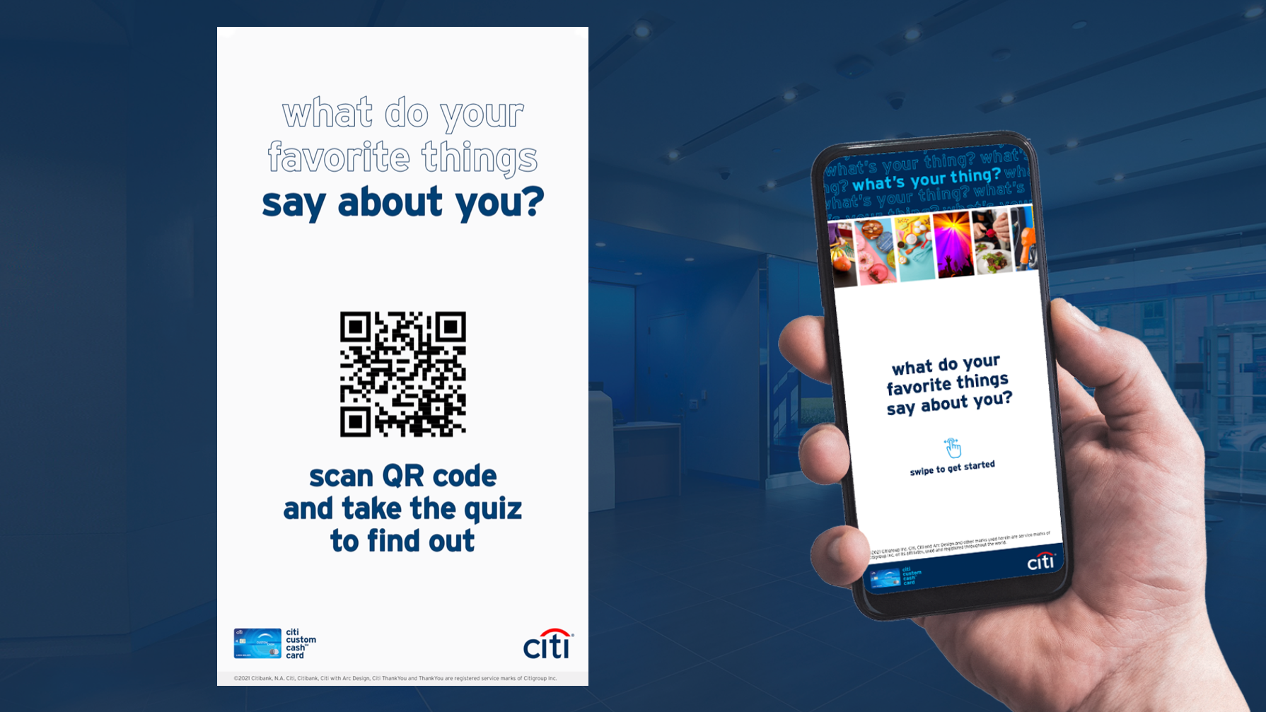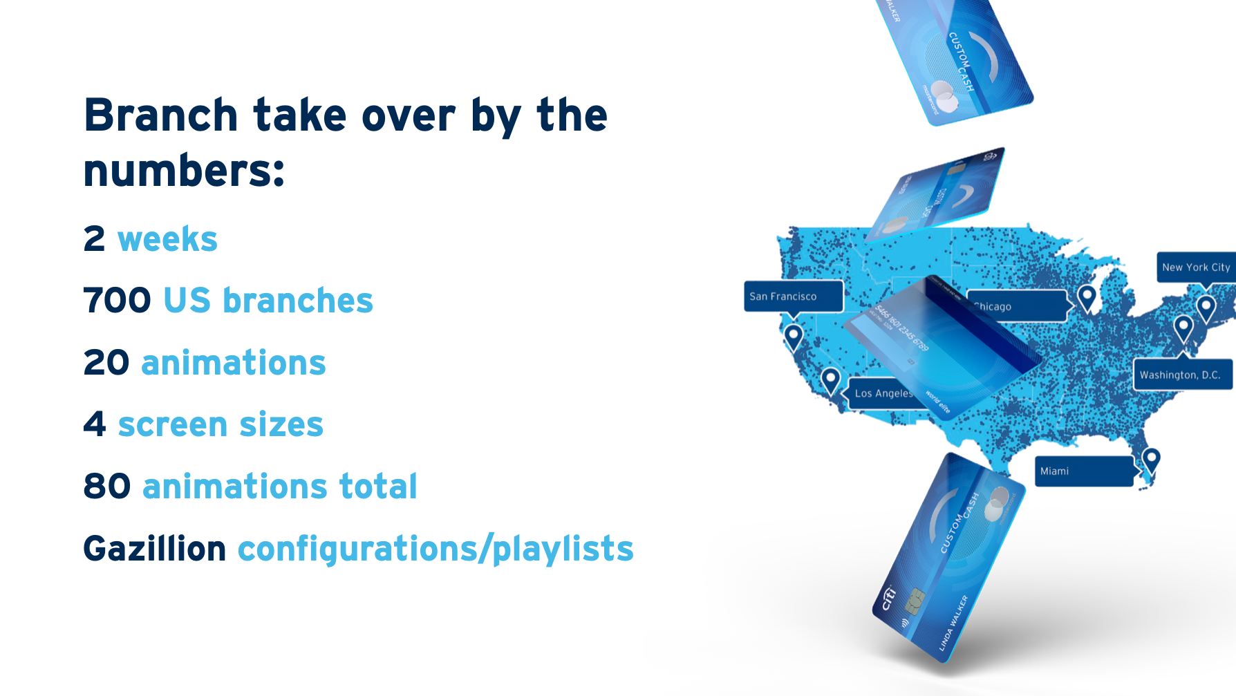 We were tasked to develop a full in-branch digital signage takeover for the launch of Citi’s newest credit card – the Citi Custom Cash Card. We developed an awareness campaign spanning two week across Citi's over 700 branches across the US.