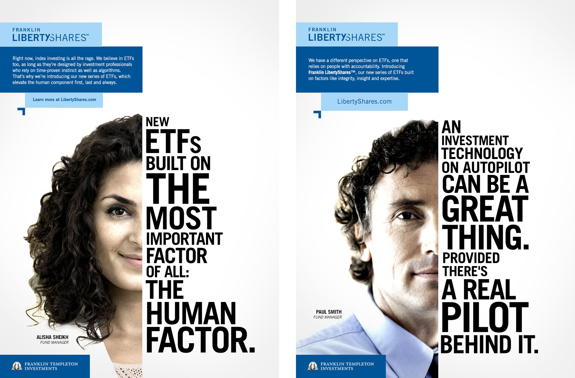 We gave Franklin Templeton a rallying cry—a new investment philosophy that focused on the expertise that only investment professionals with years of experience could provide. In a financial industry that promotes the future as being all about data sets, analytics and artificial intelligence, we posited that Franklin Templeton holds a different view. One that recognizes that while machines have their place, the world has yet to meet an algorithm that holds itself accountable. That’s why Franklin Templeton’s LibertyShares suite is powered by the kind of integrity, insight and expertise only people can provide. In short: when it comes to ETFs, it’s time to put stock in the most important factor of all…