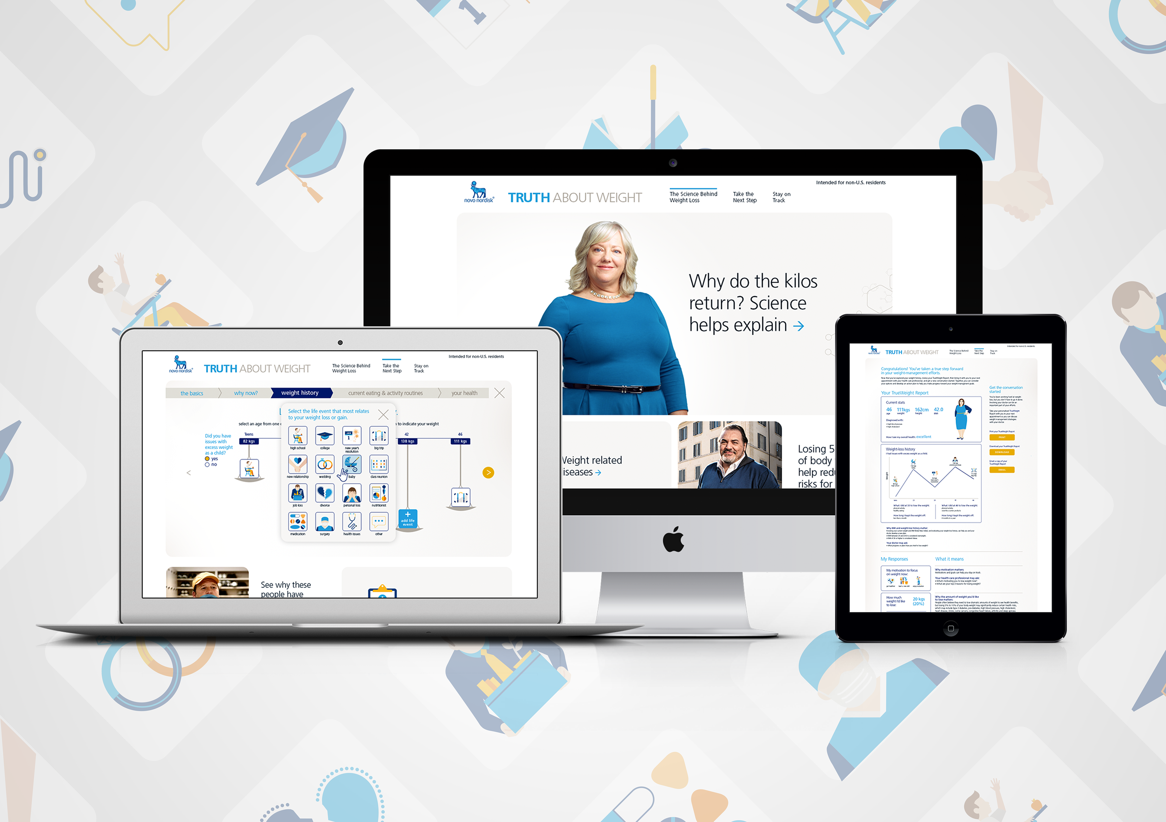 New studies suggest that the reason it’s so difficult to lose weight and keep it off has more to do with certain hormones in your body than with your psychological makeup. Novo Nordisk told this story to patients who have struggled for years with weight management. A deceptively simple two page tiled design contains a wealth of information, including a BMI calculator, testimonial videos, a personal weight assessment tool, questions to ask your physician and a doctor finder tool—allowing patients to find medical specialists in their area.