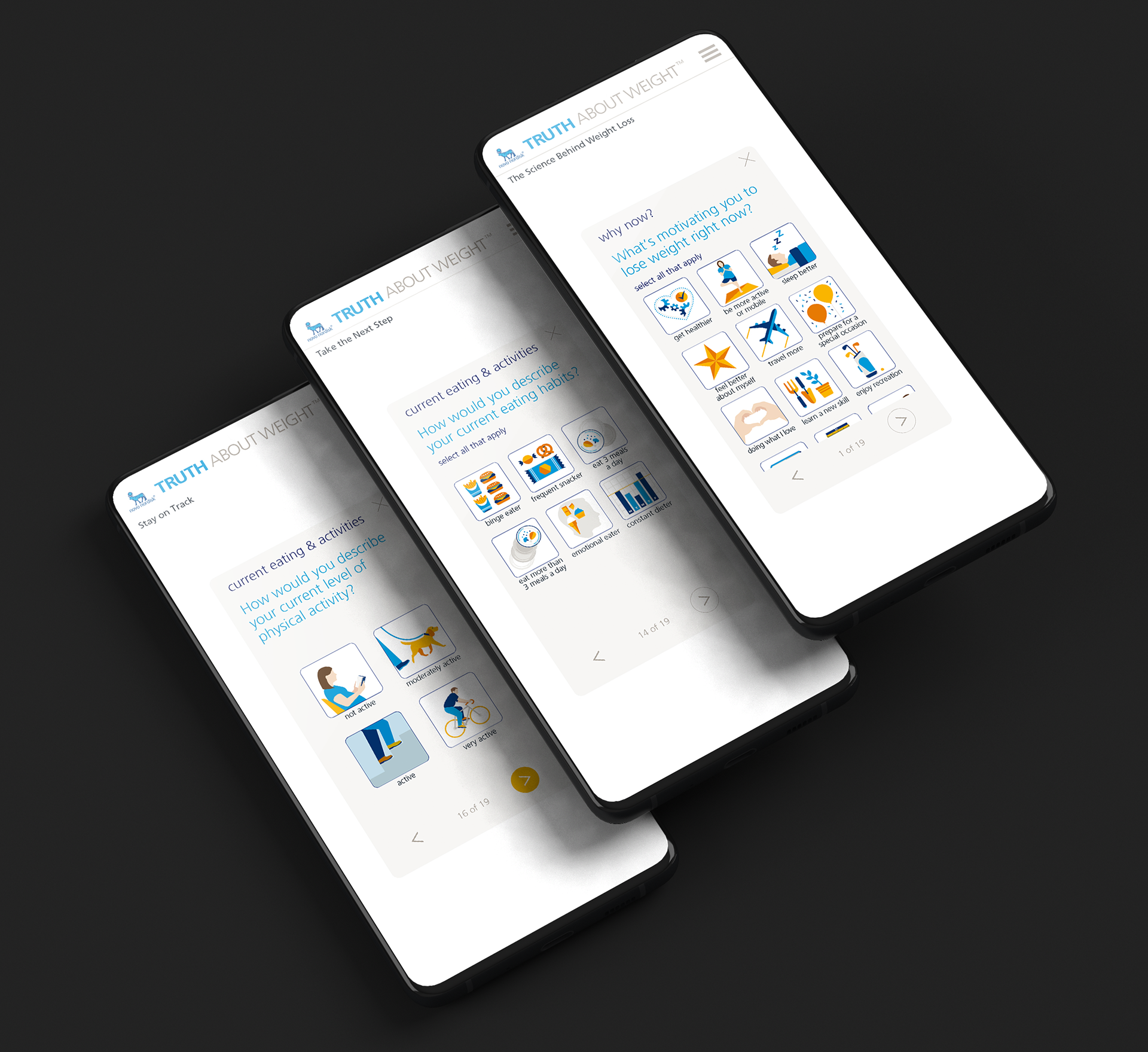 The TrueWeight History Assessment tool helps people explore their relationship with weight over time. An intuitive user interface coupled with contemporary illustration and design make it easy to use. Upon conclusion, users receive a personalized report they can bring to their next doctor’s appointment to make the dieting discussion go much more smoothly.